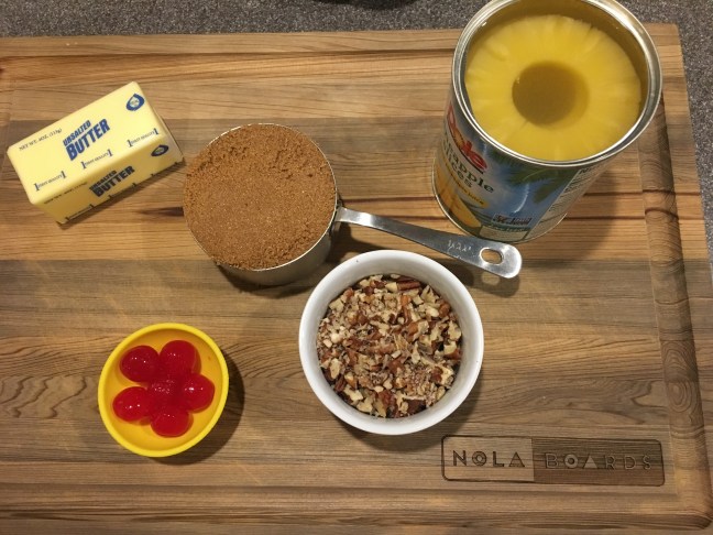 Topping ingredients: butter, dark brown sugar, canned pineapple rings, toasted pecans, and maraschino cherries.