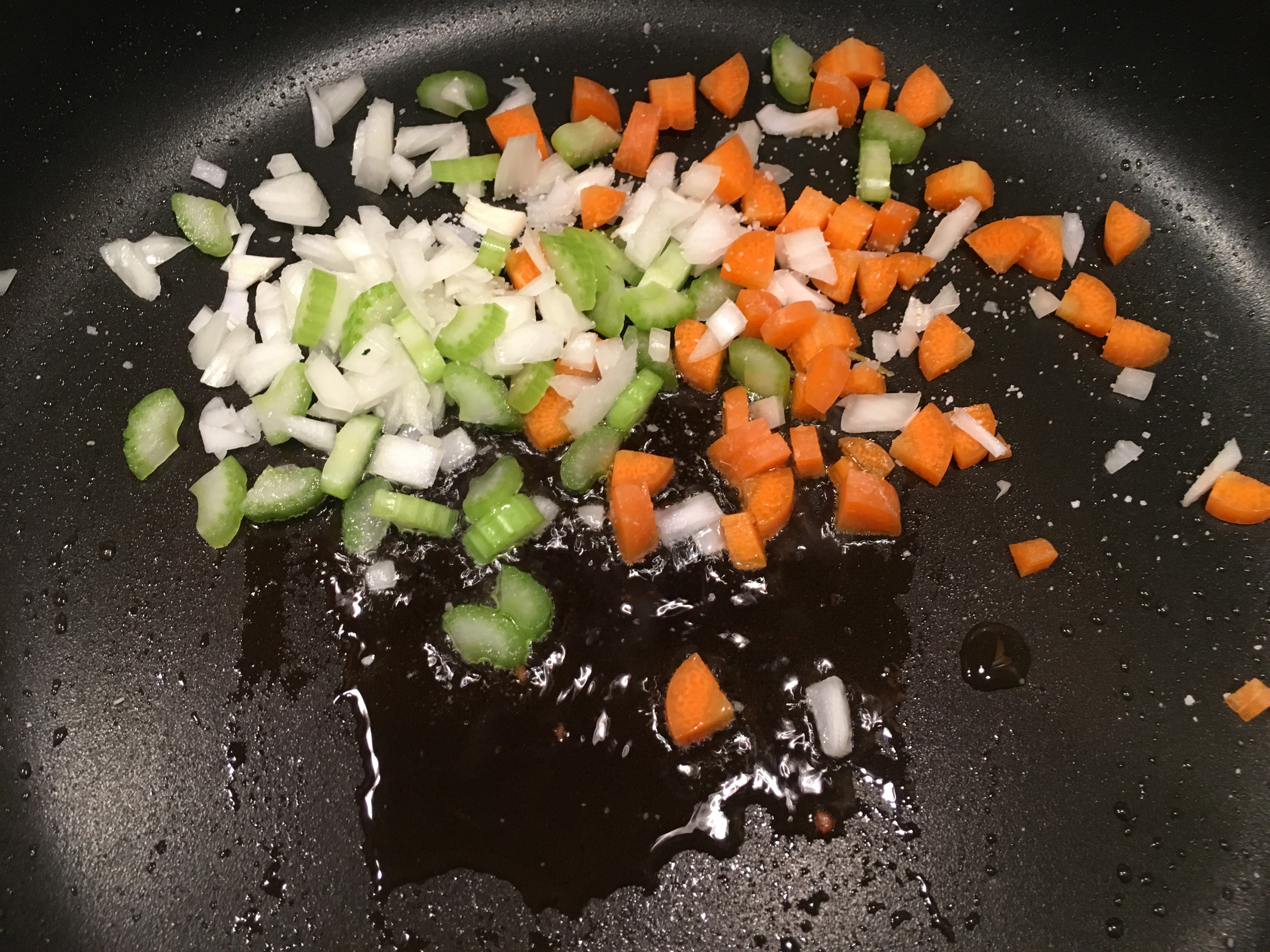 Celery, onion, and carrot added to hot oil, along with a pinch of Kosher salt.