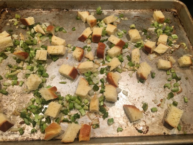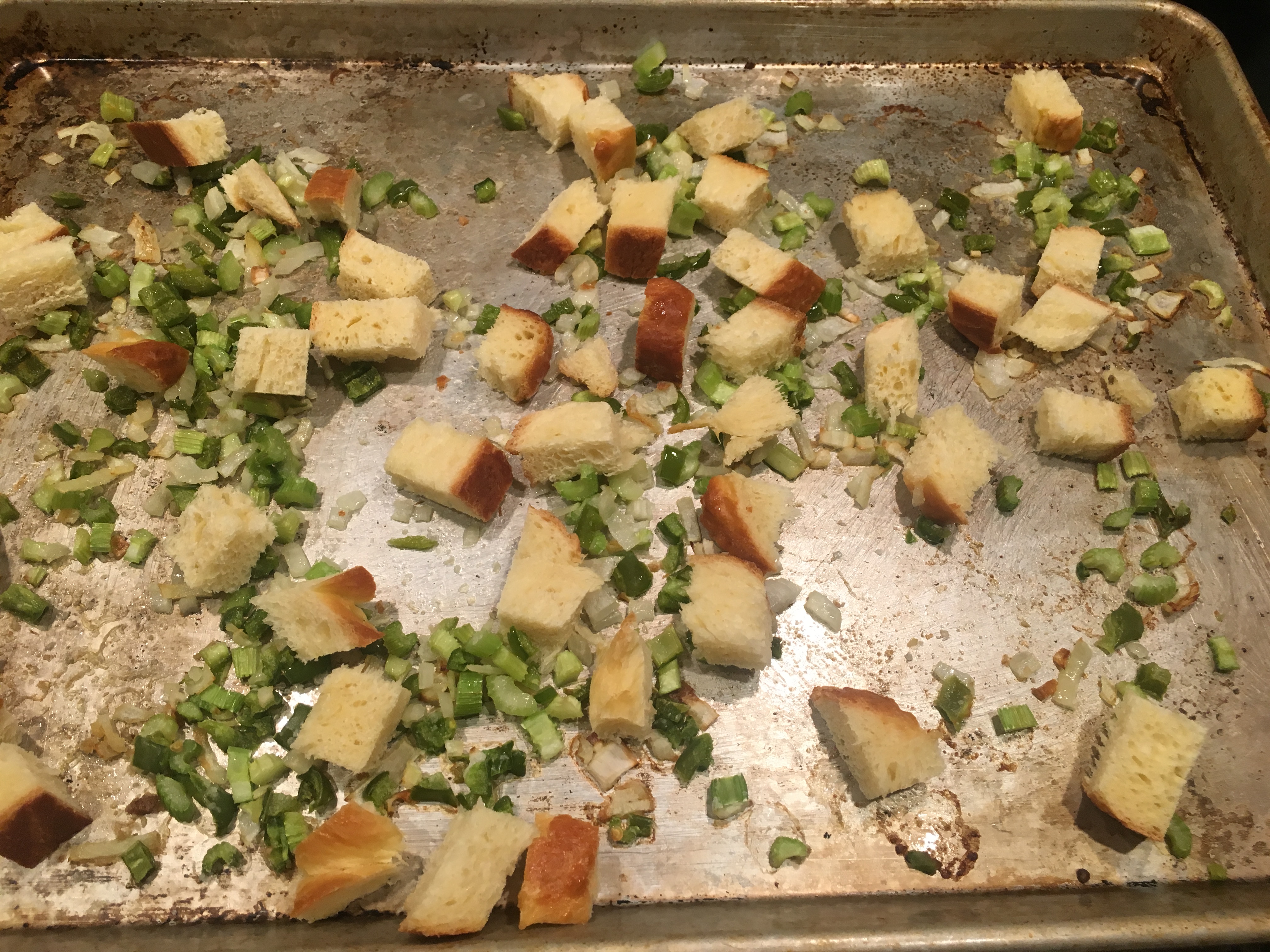 Cubed Challah added to the vegetables and put back in the oven for 10 minutes.
