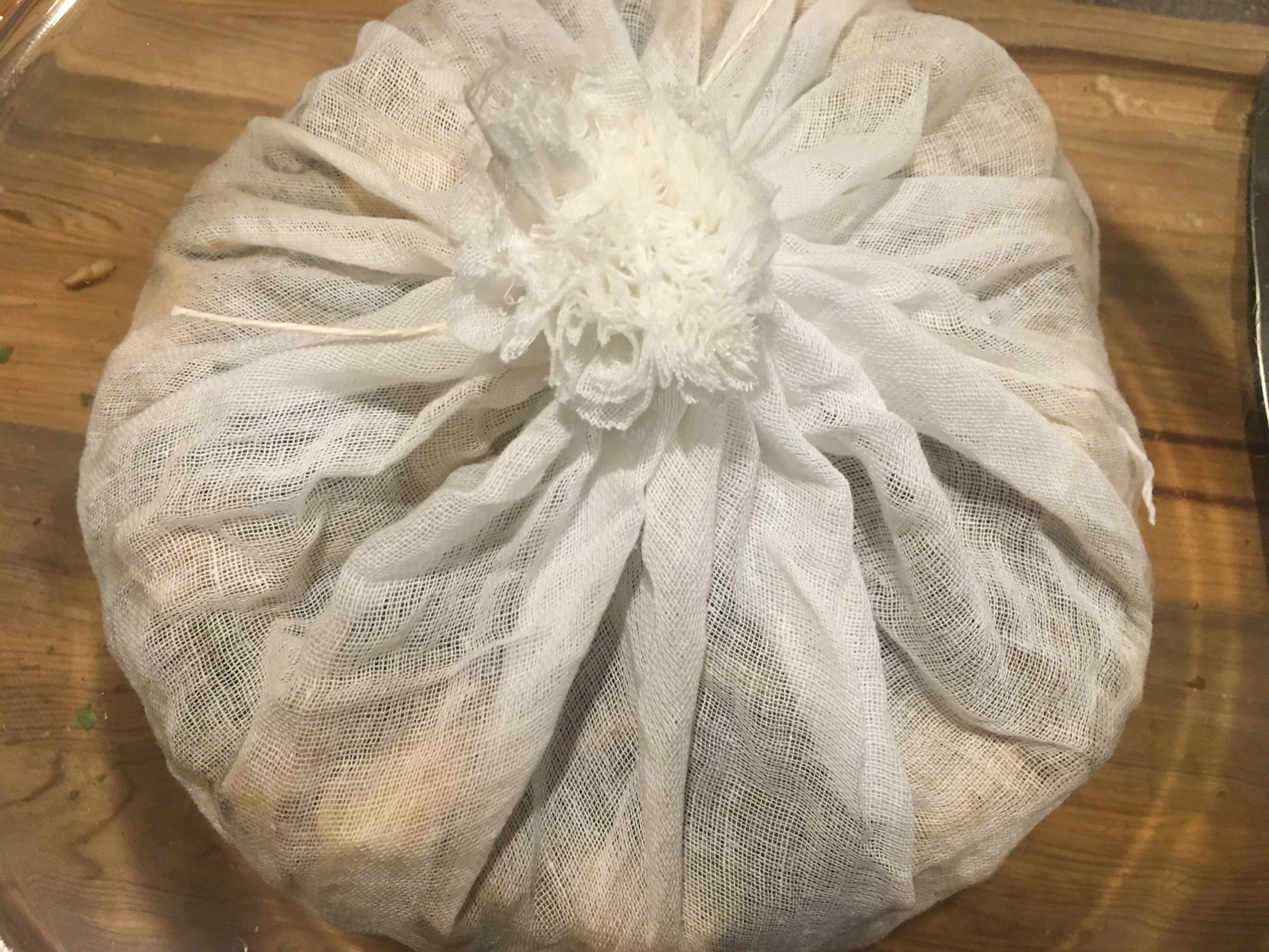 Stuffing placed in cheesecloth and tied into a bag before microwaving.