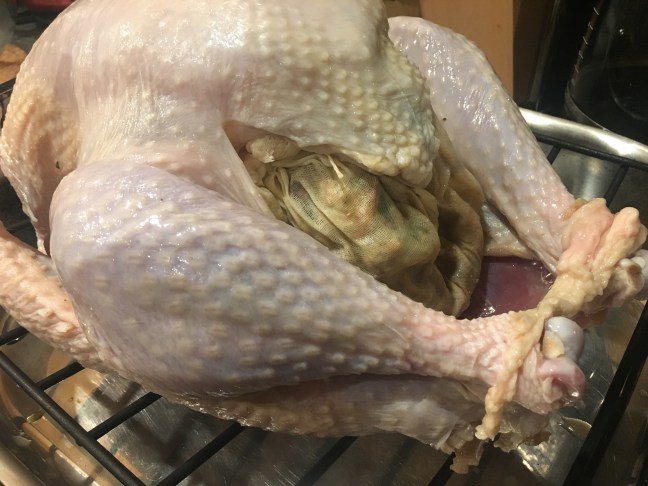 Microwaved stuffing placed inside turkey.