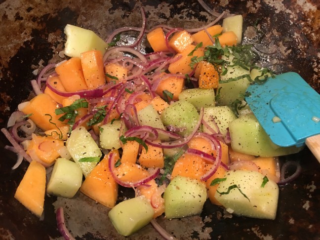 Basil, Kosher salt, and pepper sprinkled over melon.