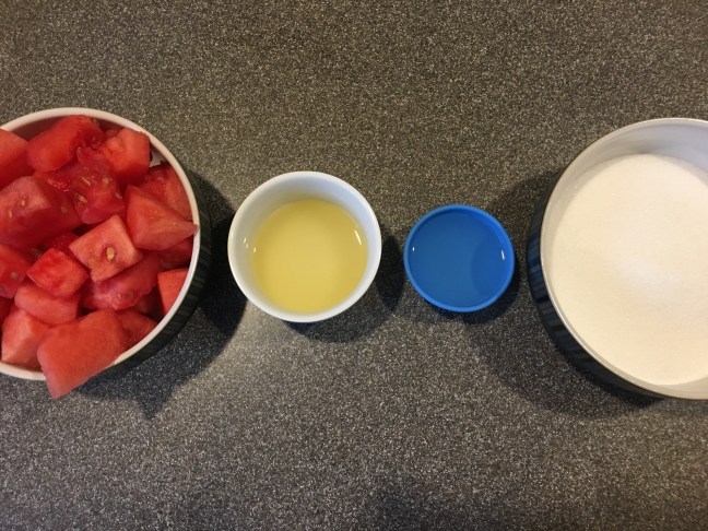 Sorbet ingredients: watermelon, lemon juice, vodka, and sugar.