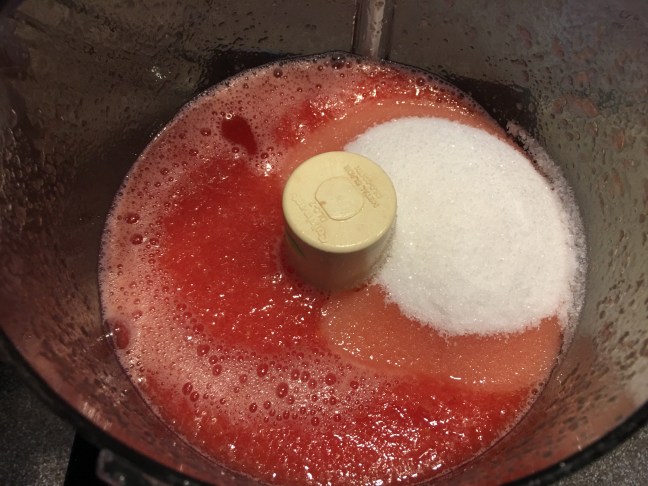 Lemon juice, vodka, and sugar added to watermelon puree.