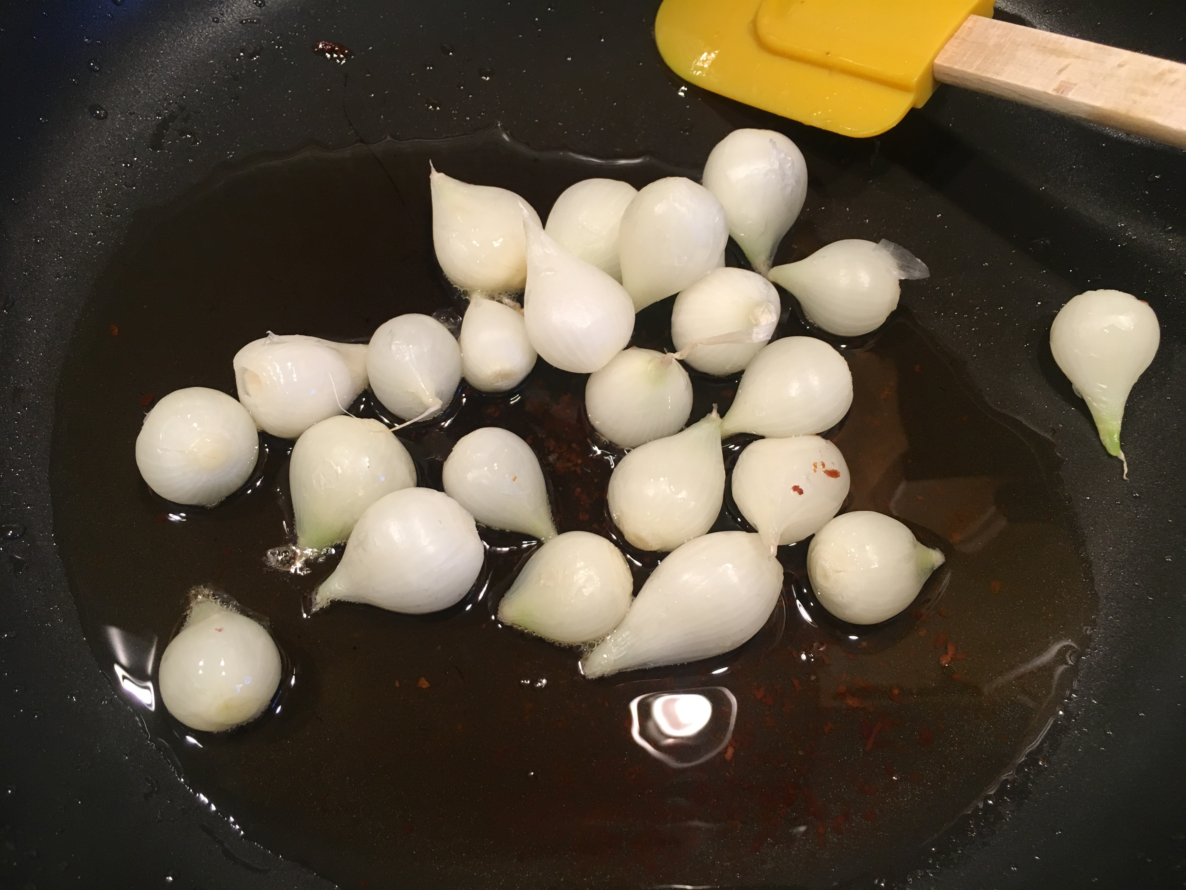 Pearl onions added to pork fat.