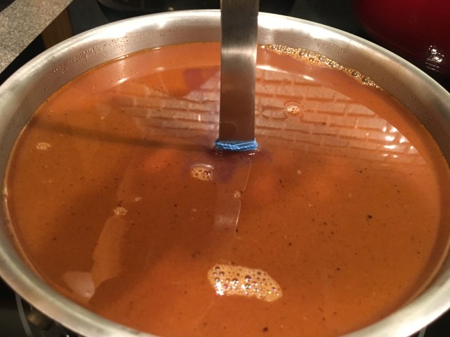 Cooking liquid placed in saucier over high heat. A rubber band is used to measure fluid reduction.