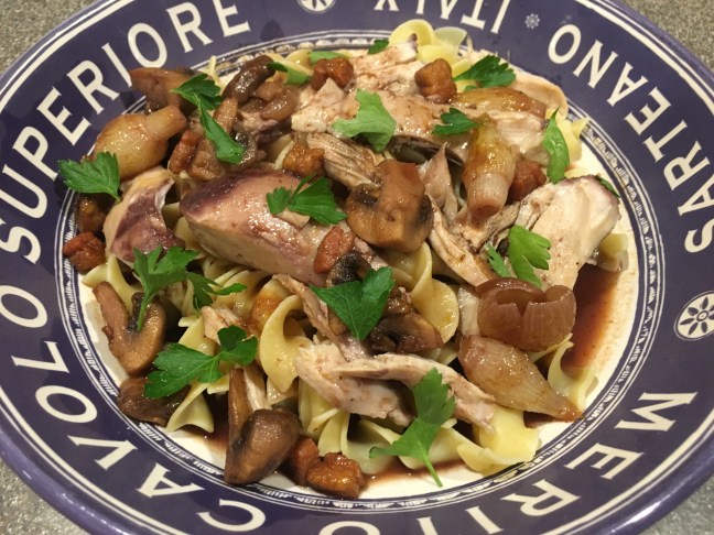 Coq au Vin served over egg noodles.