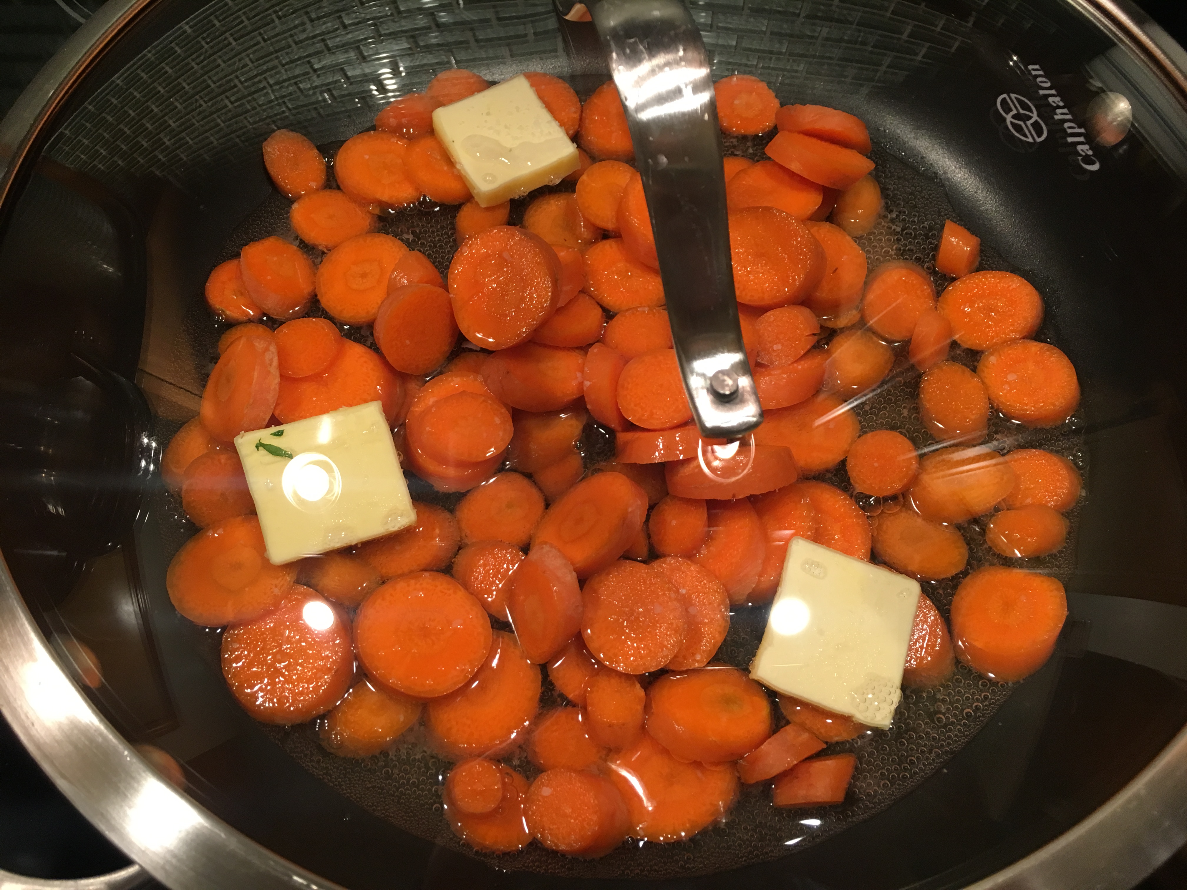 Carrots, Kosher salt, butter, and ginger ale in a skillet over medium heat. Lid placed on the pan.