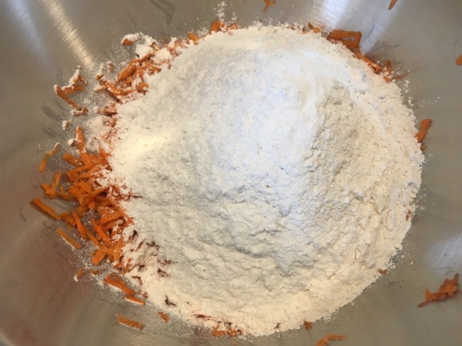 Dry ingredients added to shredded carrots.
