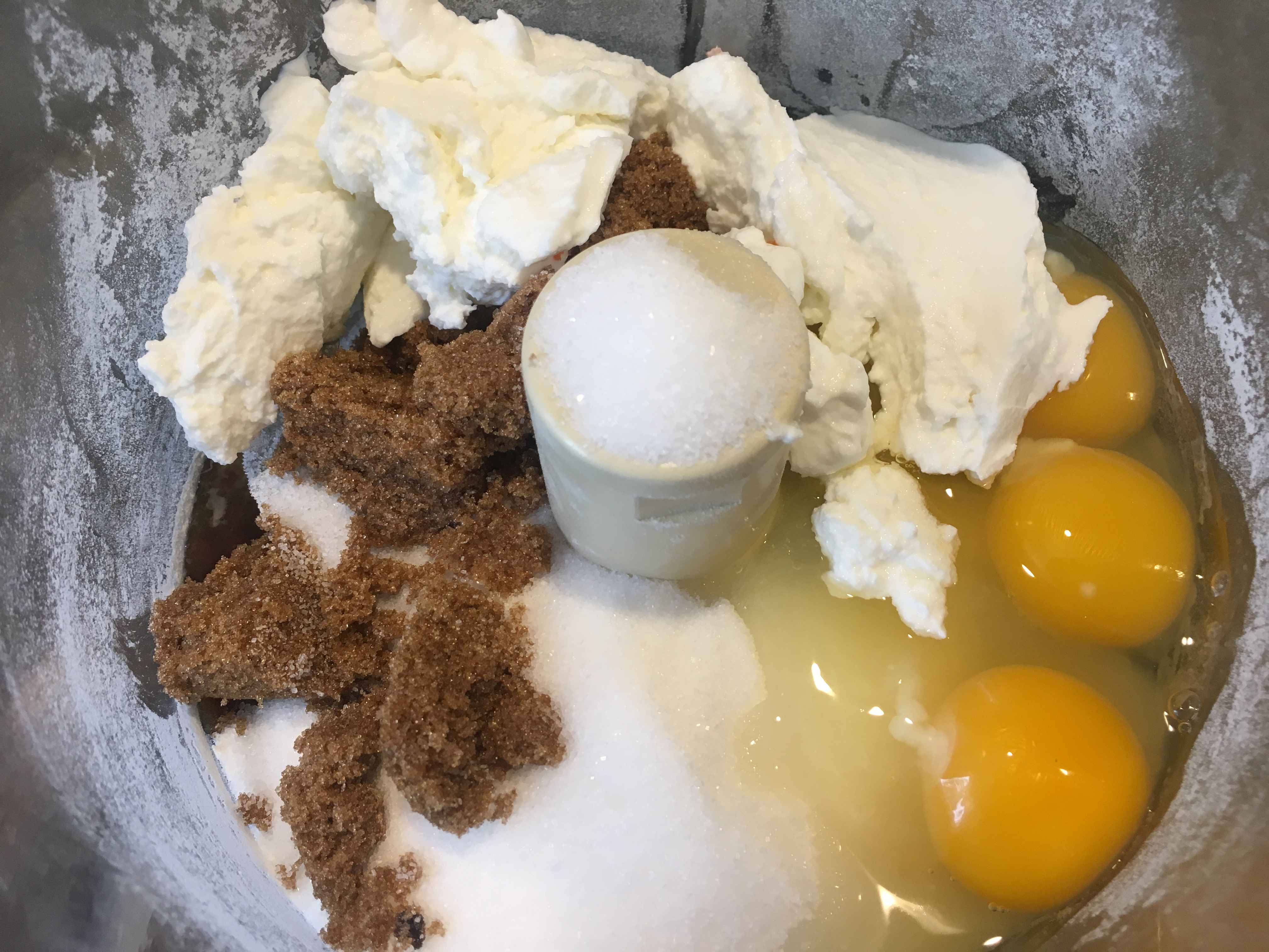 Wet ingredients in food processor: sugar, dark brown sugar, eggs, and plain yogurt.