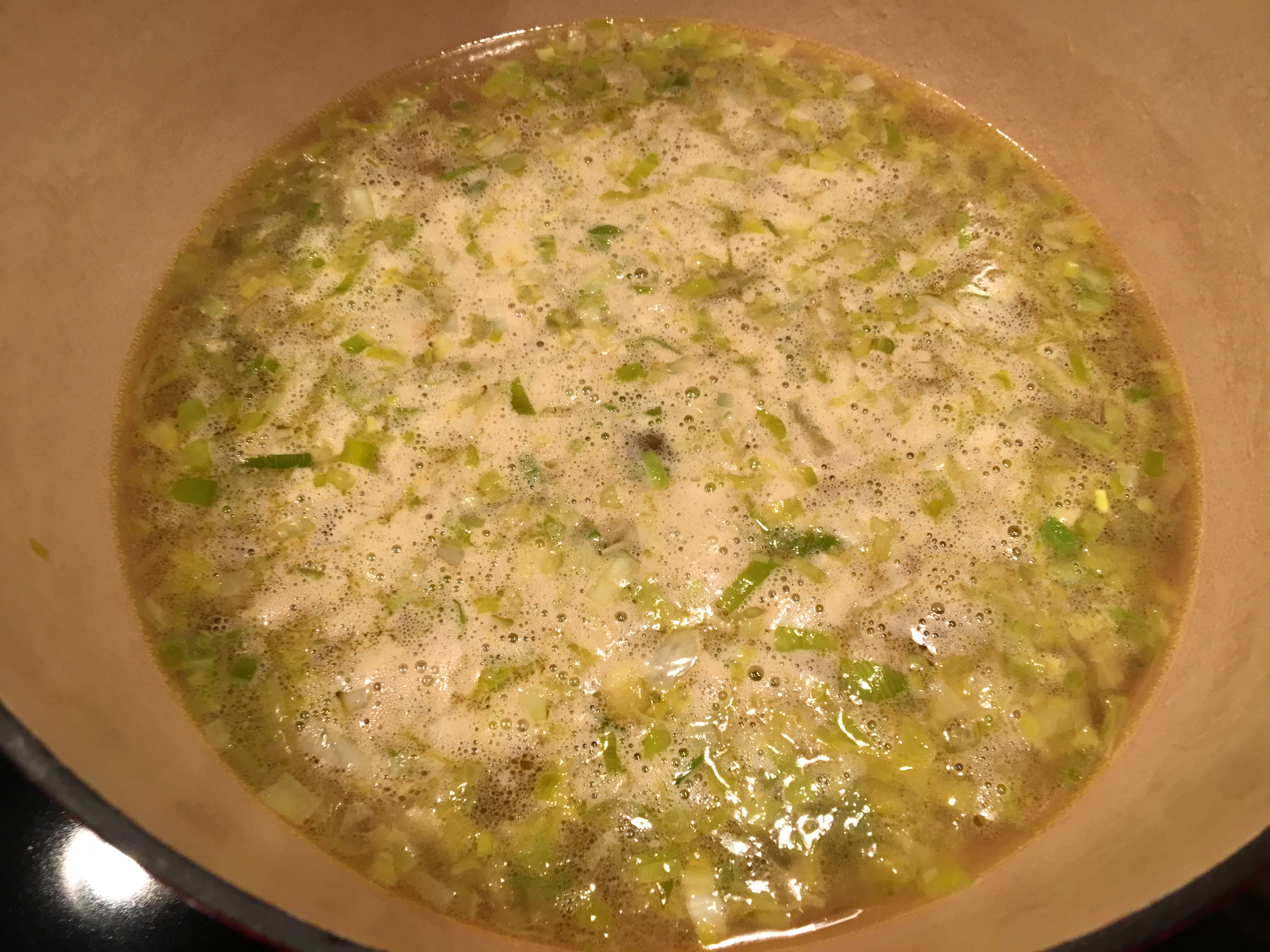Liquid brought to a simmer.
