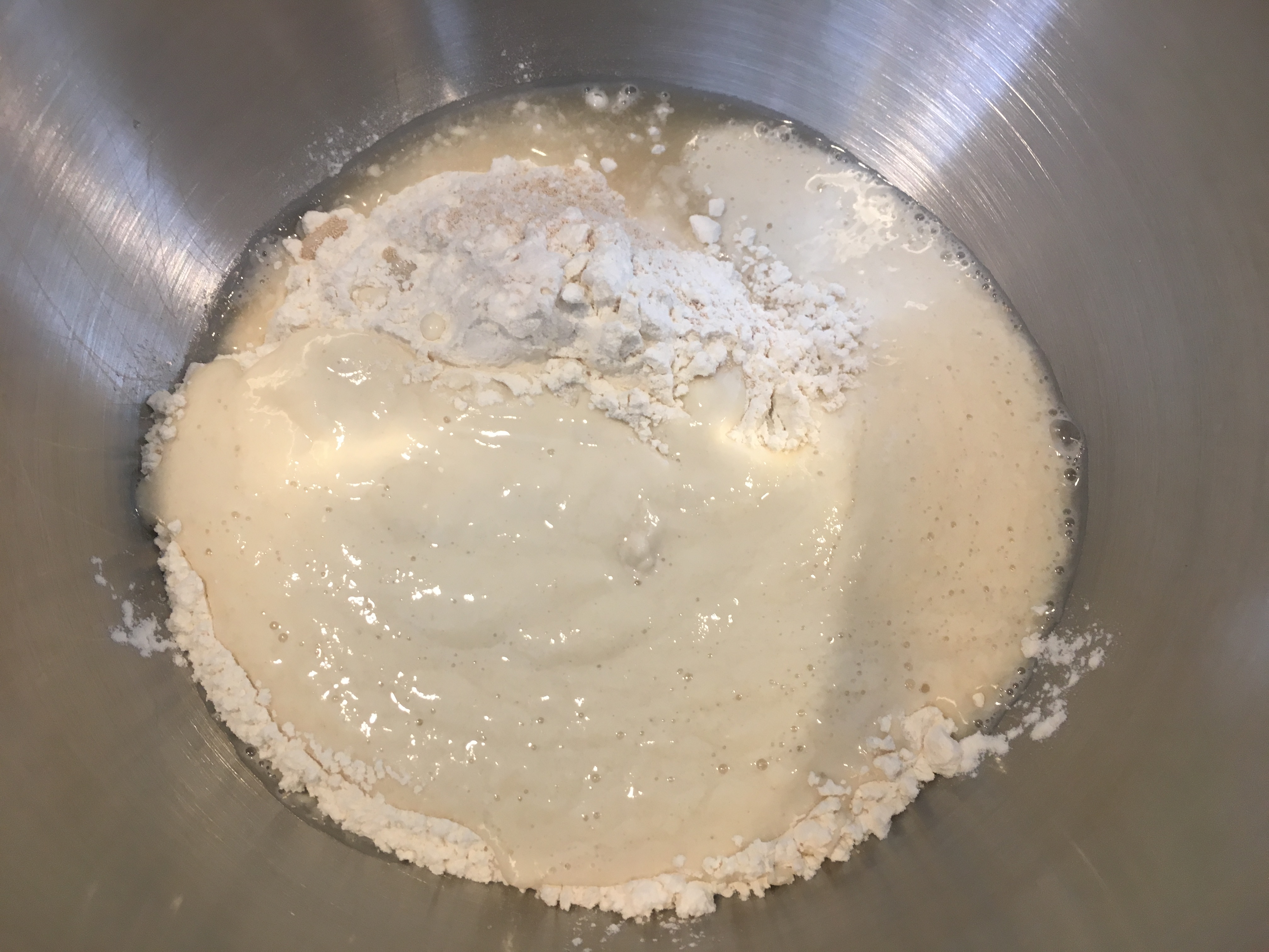 Sponge in mixer bowl, along with flour, yeast, and salt.