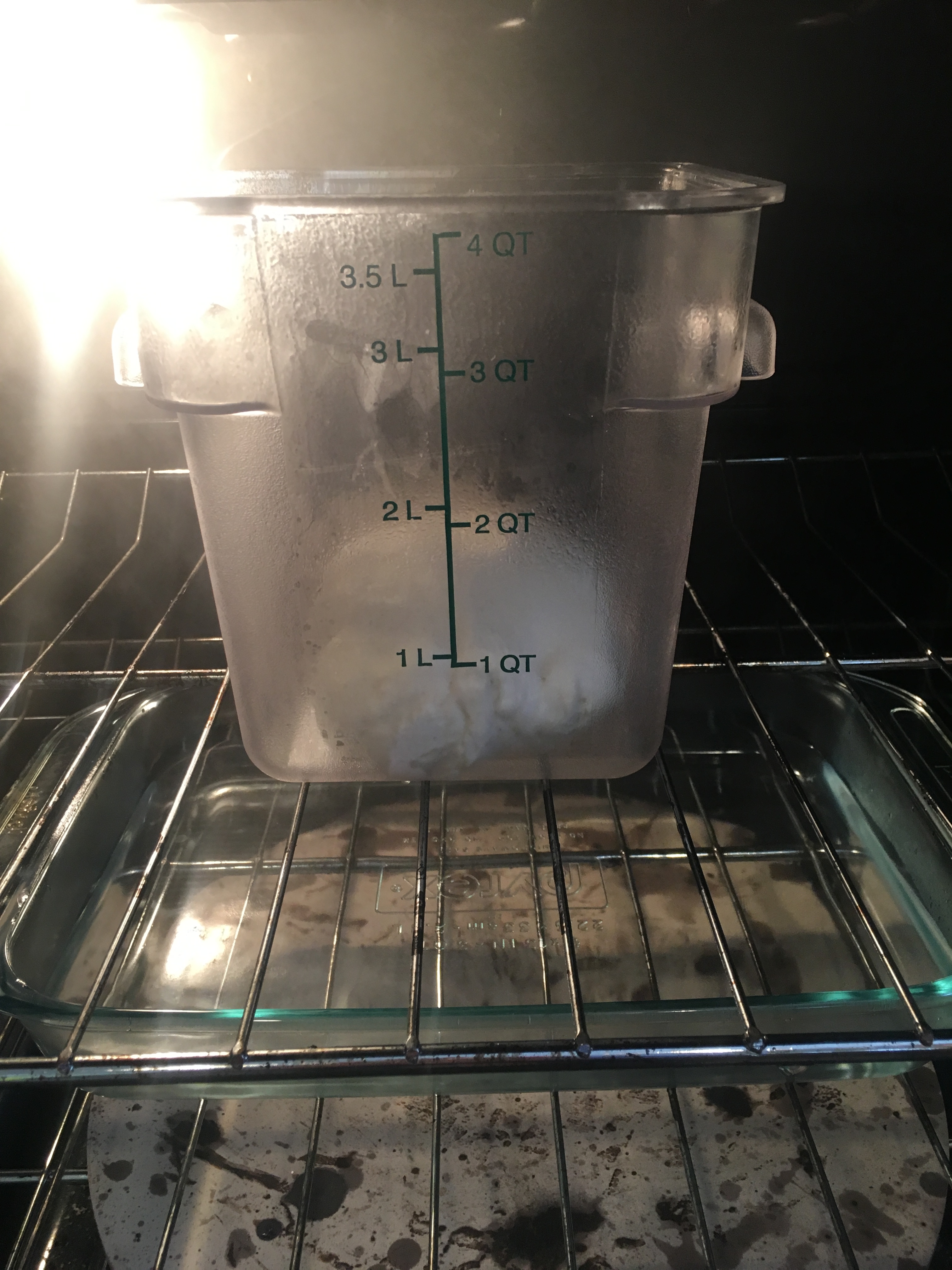 Dough placed in oven with pan of hot water below.