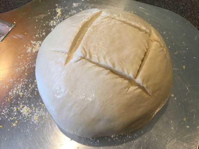 Dough placed on pizza peel, brushed with cornstarch mixture, and cut with a sharp knife.