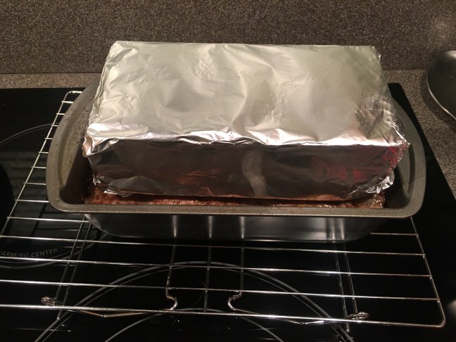 Foil-wrapped brick resting on meat while it cools.