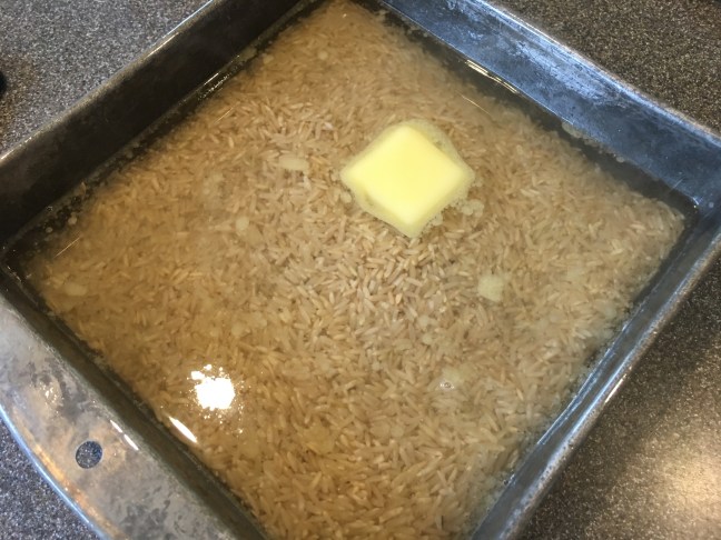 Brown rice, hot water, butter, and Kosher salt in an 8-inch pan.