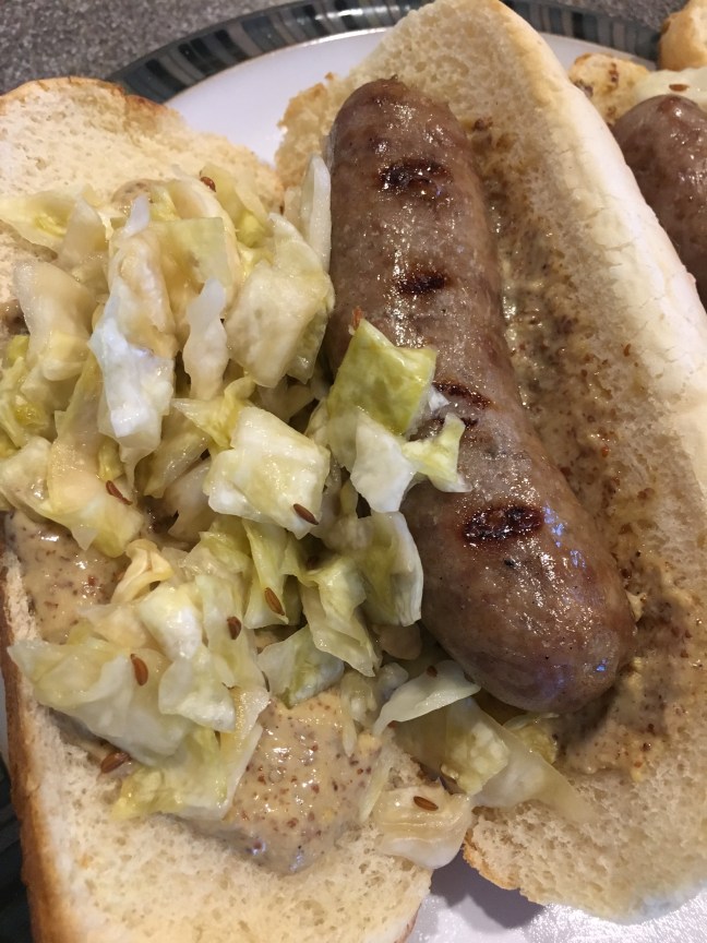 Sauerkraut served on brats with mustard.