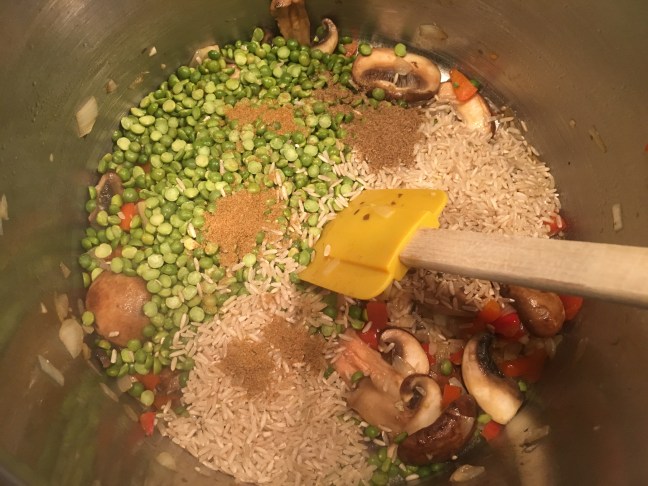 Split peas, brown rice, coriander, and cumin added to the pot.