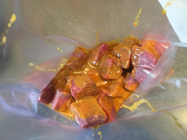 Marinade poured over beef cubes.
