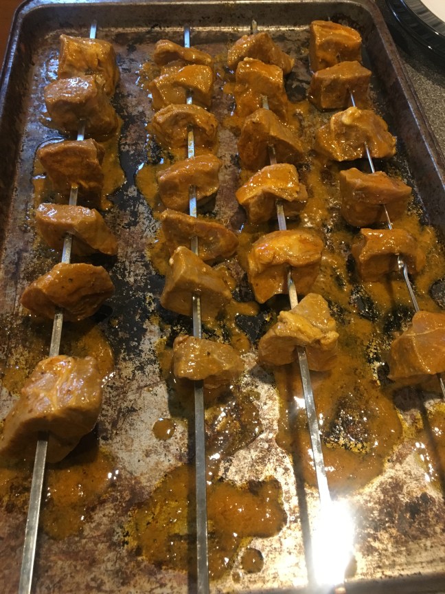 Beef cubes threaded onto metal skewers.