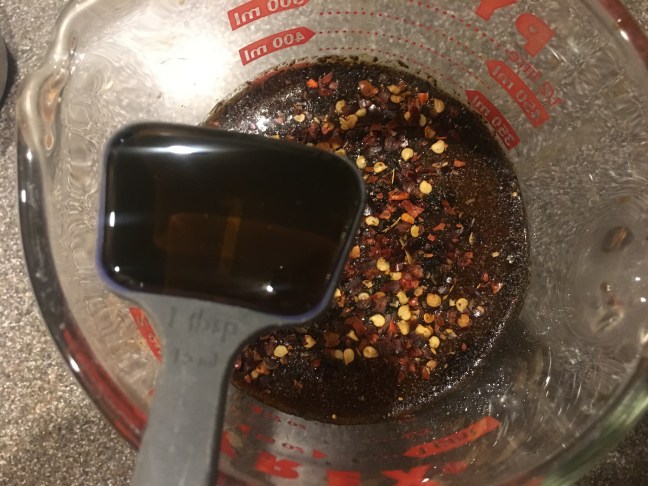 Honey being added to soy sauce, Worcestershire sauce, pepper, onion powder, red pepper flakes, and liquid smoke.