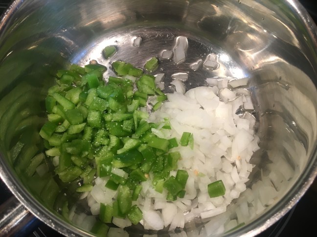 Vegetable oil, onion, green bell pepper, and Kosher salt in a medium saucier.