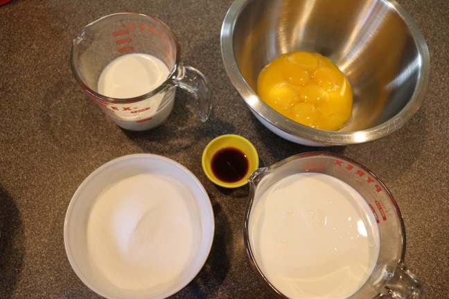 Ingredients for Alton’s ice cream: heavy cream, egg yolks, vanilla extract, sugar, and half and half.