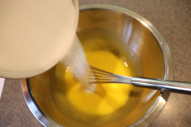Slowly whisking sugar into yolks.