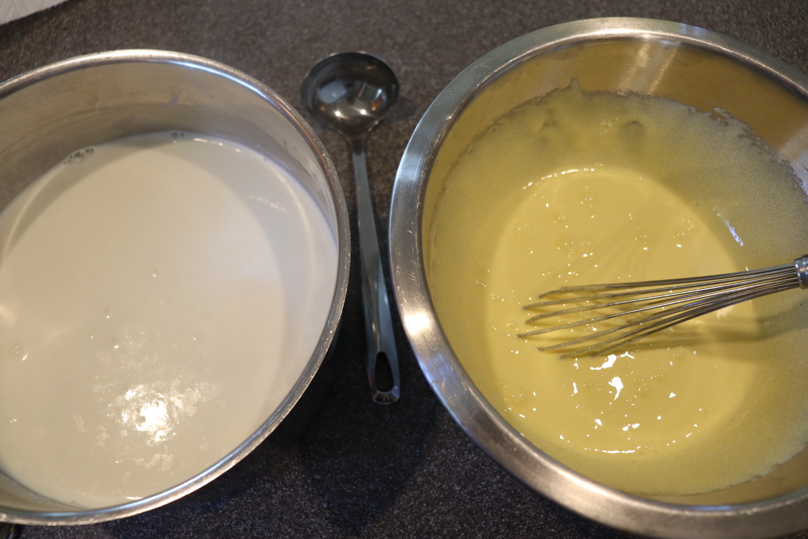 Ready to temper the egg yolks by slowly whisking in the simmered dairy.