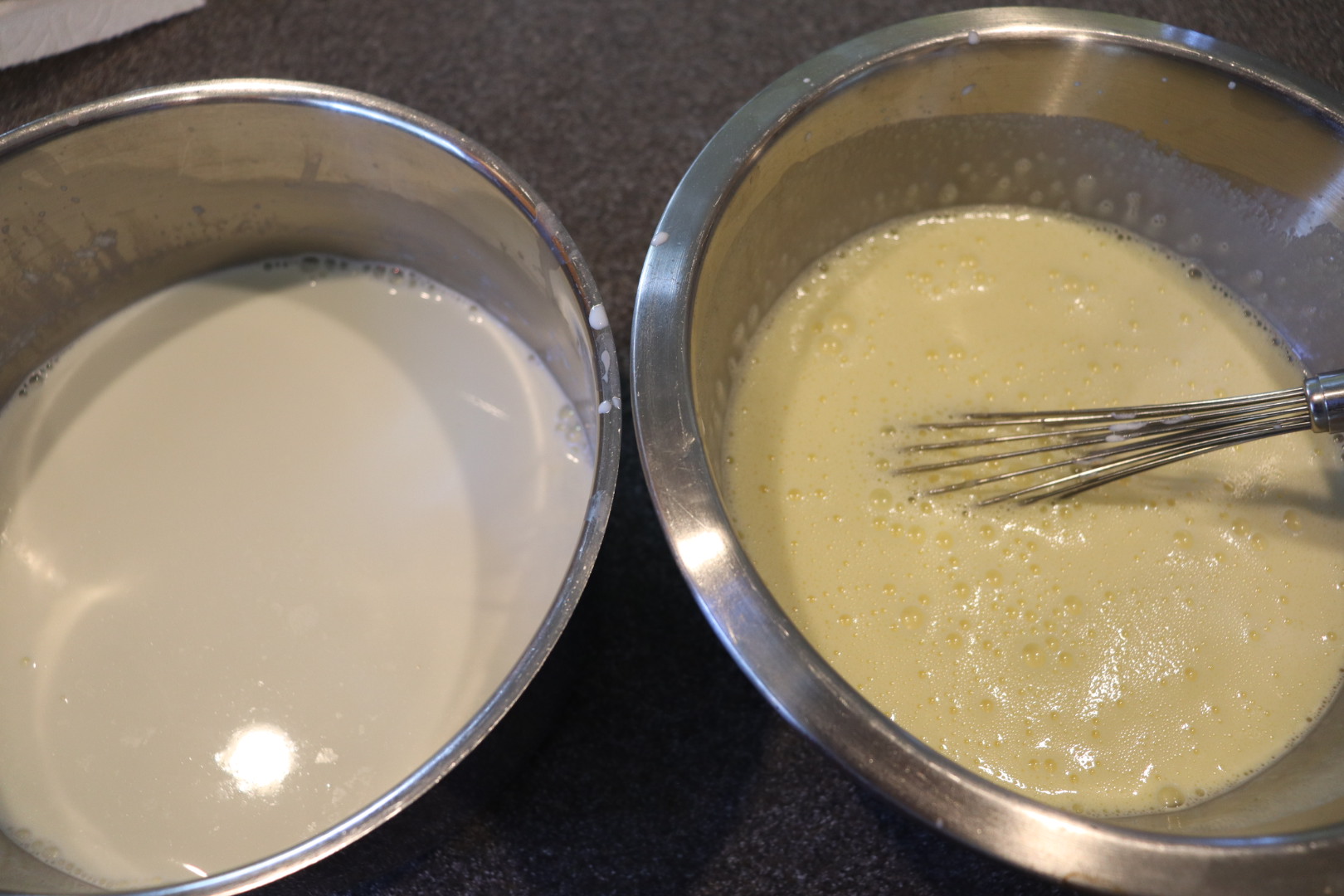 Egg mixture (right) after adding about 1/3 of the dairy.