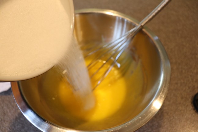 Adding the sugar to the yolks.