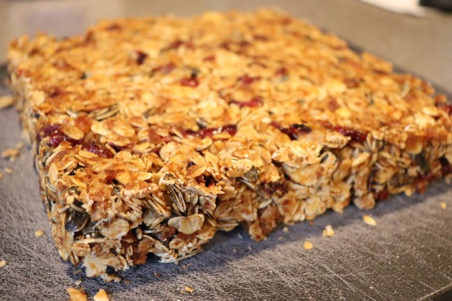 Cooled granola bars turned onto a board.