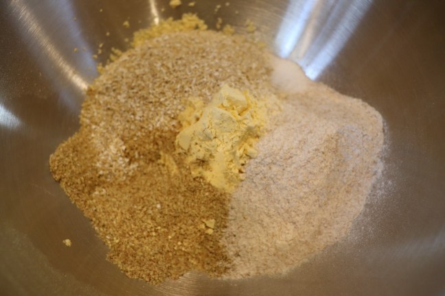 Protein powder, oat bran, whole wheat flour, wheat germ, and Kosher salt.