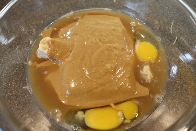 Silken tofu, dark brown sugar, eggs, apple juice, and peanut butter.
