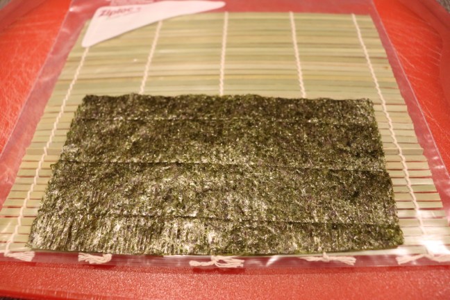 A half sheet of Nori placed rough side up on a plastic-covered sushi mat.