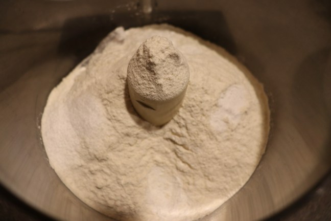 Flour, baking powder, baking soda, and Kosher salt in food processor.