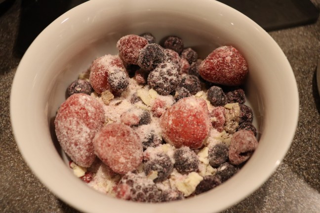 Fruit mixture divided among ramekins.