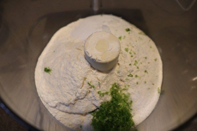 Flour, sugar, lime zest, and Kosher salt in food processor.