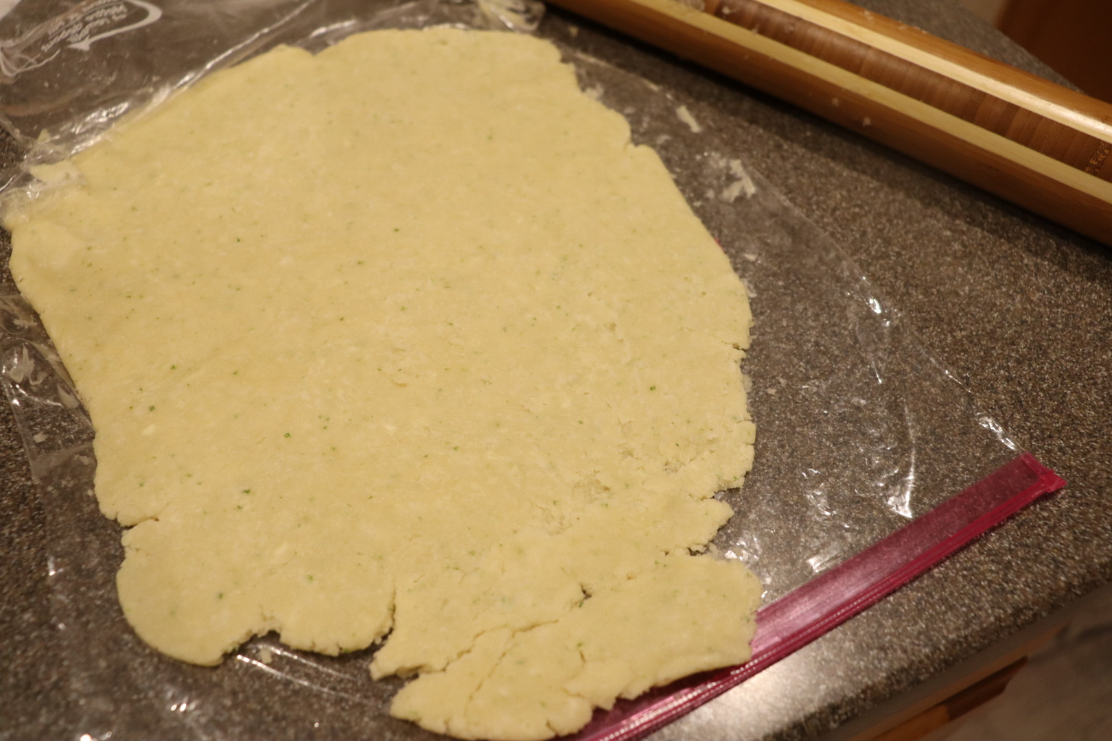 Dough rolled out inside Ziplock. Top of bag removed to invert dough directly onto fruit.