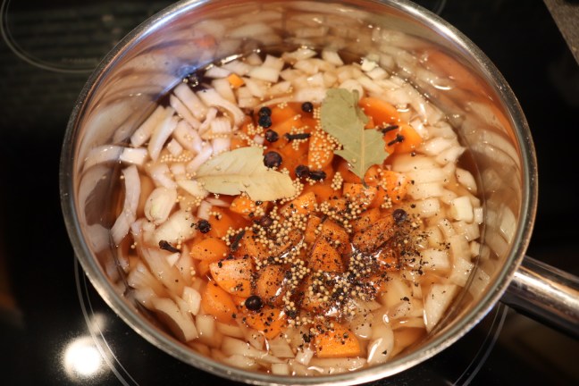 Water, cider vinegar, red wine vinegar, onion, carrot, Kosher salt, pepper, bay leaves, cloves, juniper berries, and mustard seed in a saucepan.