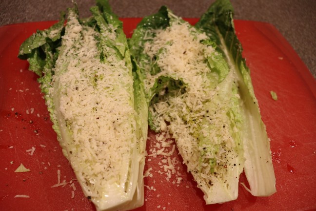 Romaine hearts after dipping/pressing into grated Parmesan.