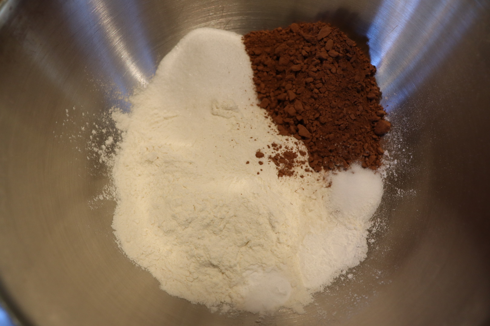 Dry ingredients: flour, sugar, cocoa powder, salt, baking powder, and baking soda.