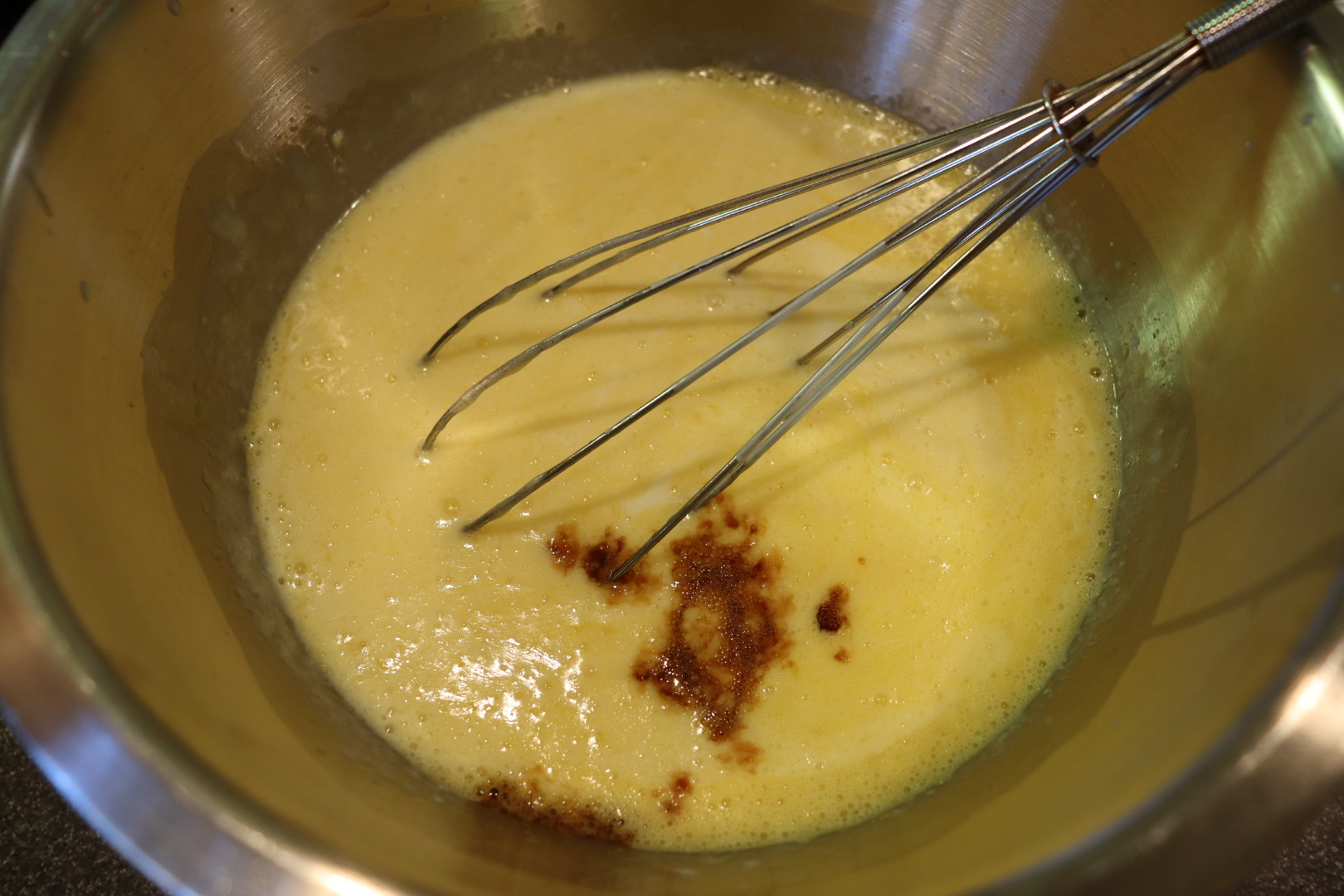 Eggs, melted butter, room temperature buttermilk, and vanilla extract.