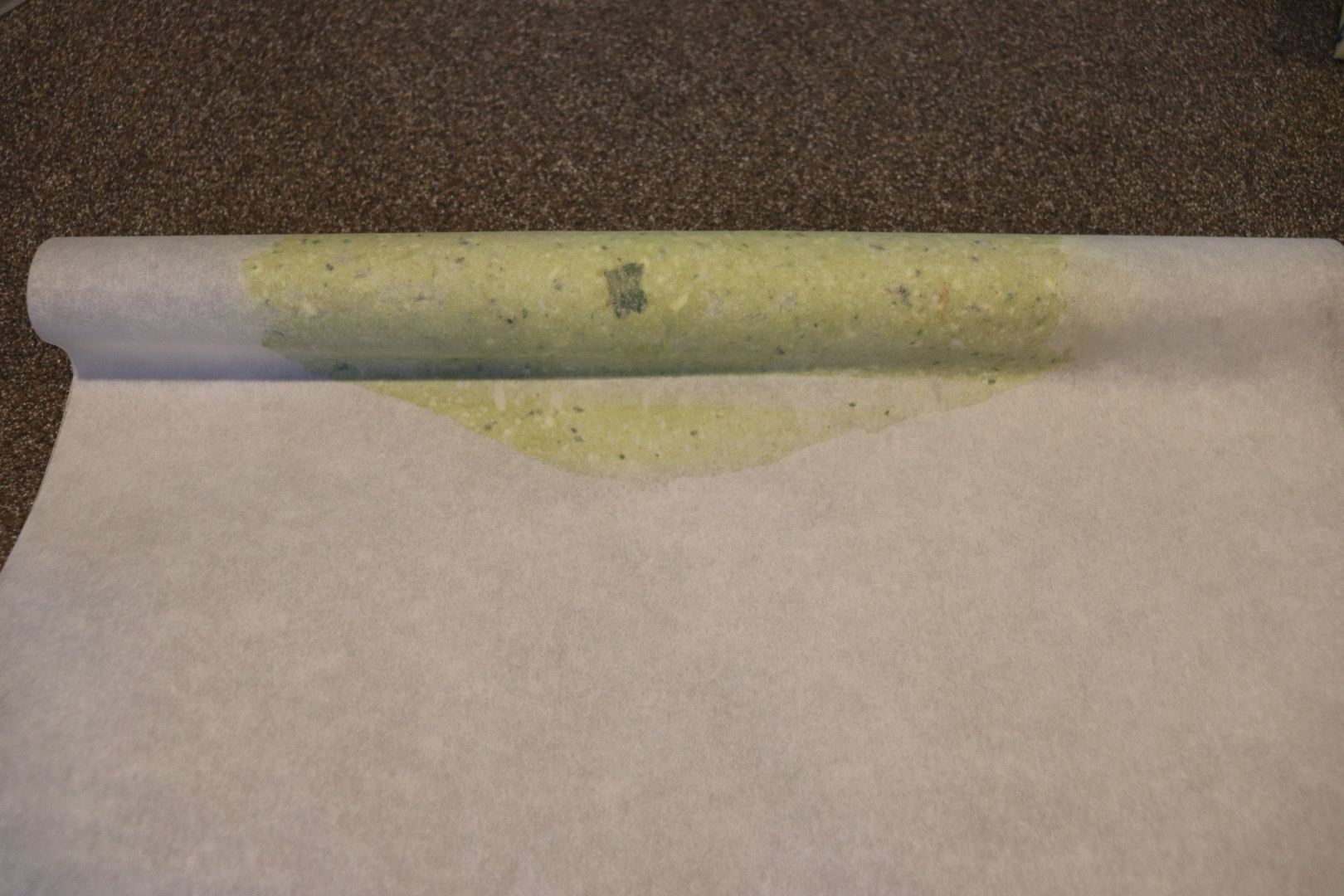 Butter pushed into cylindrical shape using edge of sheet pan.