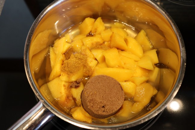 Mangoes, brown sugar, cider vinegar, curry powder, and lime juice in a large saucepan.