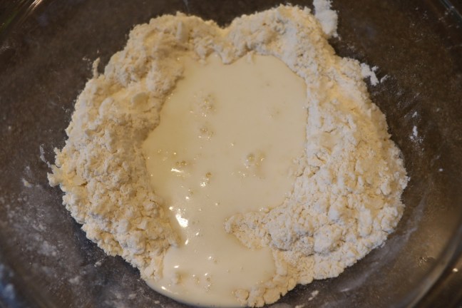 Milk poured into well of dry ingredients.