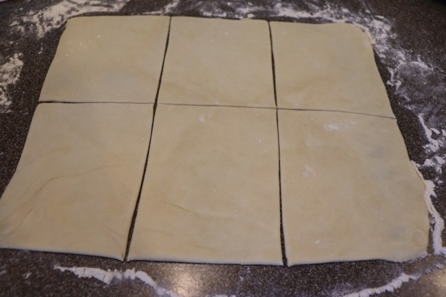 Half of the dough rolled into a 12″ x 10″ rectangle and cut into six 4″ x 5″ rectangles.