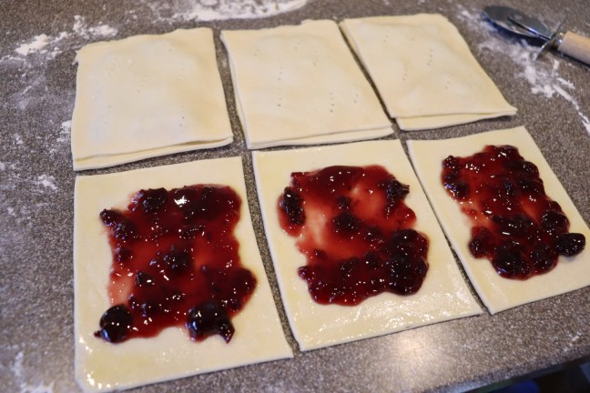 Second batch of dough rectangles being placed on top of filling after docking with a fork.