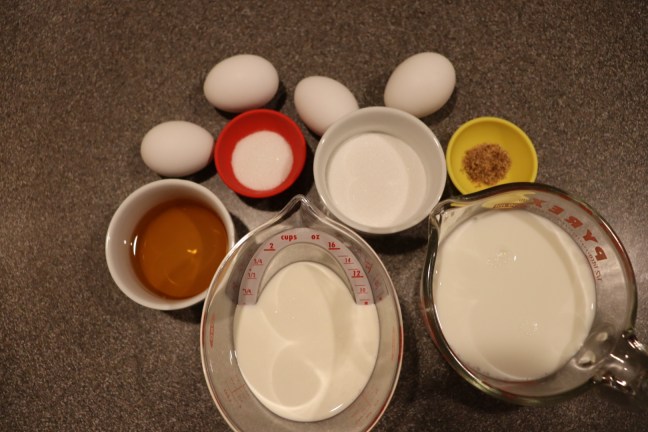 Ingredients for Alton’s eggnog: eggs, sugar, nutmeg, bourbon, cream, and milk.