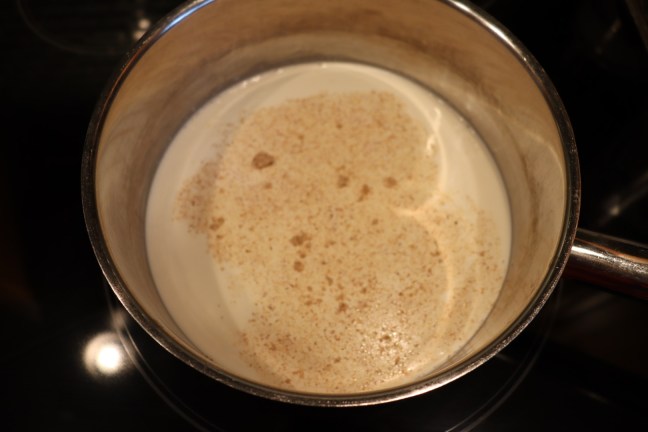 Milk, cream, and nutmeg in a saucepan.